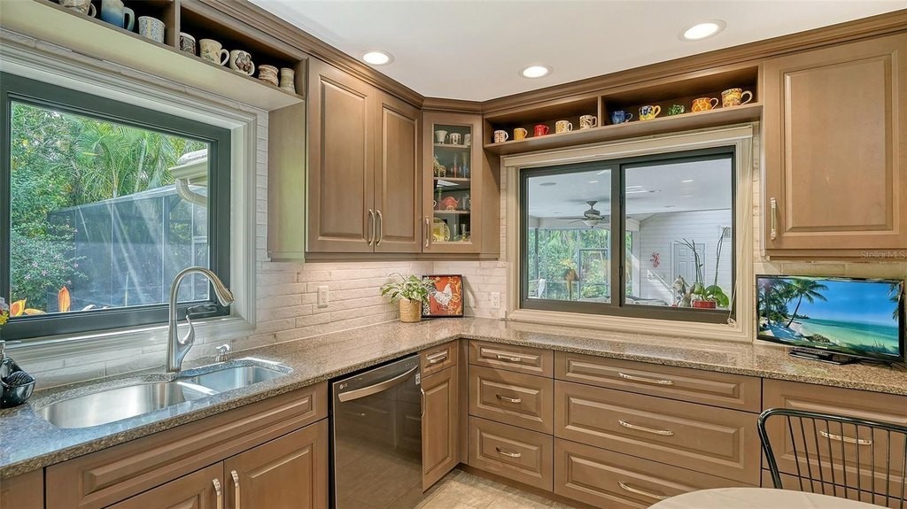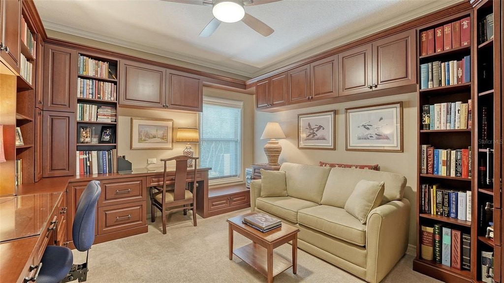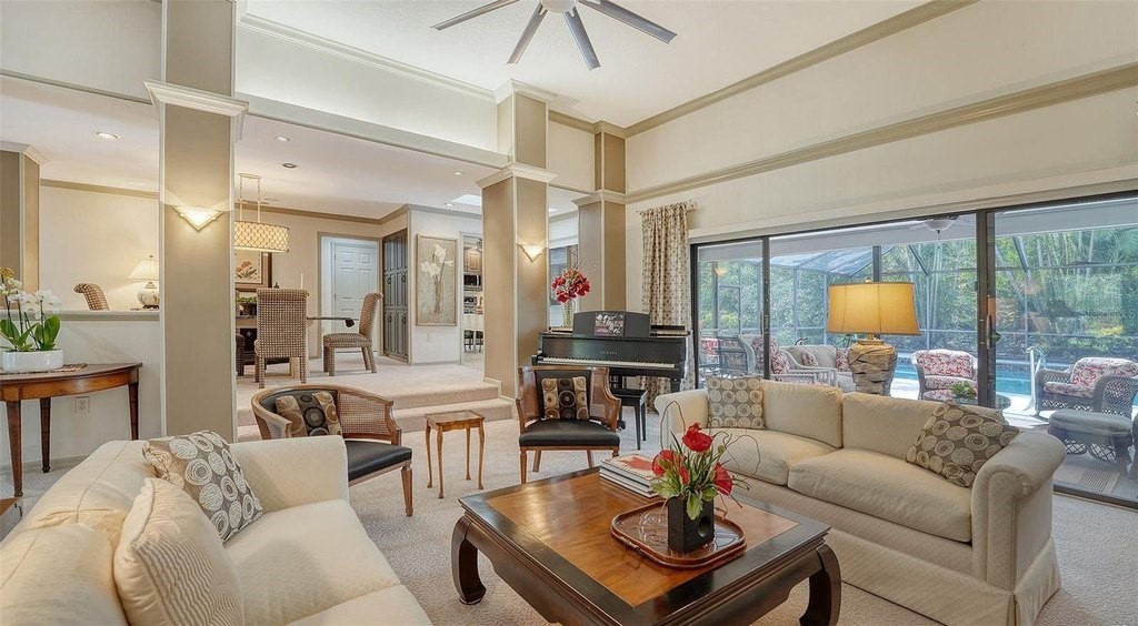 Located in Sarasota’s coveted and 24-hour guard-gated West of Trail community, The Landings, this beautifully reimagined 3-bedroom, 3-bath residence with a bonus room offers refined coastal living and peace of mind through extensive, high-quality updates. Situated on a lushly landscaped lot with mature trees and privacy and not in a flood zone, this 2,921 sf home blends timeless architecture with thoughtful modern improvements, all just minutes from Siesta Key’s world-famous beaches and Downtown Sarasota. Hurricane-impact windows and sliders, and the Miami-Dade rated roof and updated PVC plumbing offer structural integrity and long-term value. Design upgrades include porcelain tile flooring and beautiful custom wood cabinetry and built-ins. The fully updated kitchen features premium stainless appliances, Silestone counters, stylish cabinetry, a picture frame window overlooking the beautiful garden, a convenient pass thru window to the lanai, and custom walk-in pantry. The adjacent dining room is perfect for entertaining and the formal living room with its high ceiling is anchored by a woodburning fireplace with tiled hearth and built-ins. The split-bedroom floor plan offers privacy and functionality, with all 3 bedrooms, (one currently outfitted as a convenient home office with solid wood built-ins) boasting custom walk-in closets and lovely bathrooms. A spacious bonus room is light and bright and includes a redesigned alcove with floor-to-ceiling custom built-ins to house books, media, or art. Every inch of this home reflects quality, style, and enduring craftsmanship. The interior of the home flows seamlessly to the elegant and serene exterior where you will enjoy the professionally redesigned landscape with exquisite plantings, brick paver driveway, meandering walking path, elevated relaxation area, peaceful fountain, and custom exterior lighting. The spectacular pool area underwent a major renovation in 2020 which included resurfacing with Pebble Tec (lifetime warranty), installation of a new heater and pump, and the addition of a stylish new Italian tile surround. The lanai was rescreened in 2023 and the deck was upgraded with a high-performance Pro Tech surface for durability and beauty. Located behind the gates of The Landings, residents enjoy tree-canopied streets, a nature trail leading to Roberts Bay, and optional membership to the Landings Racquet Club, offering tennis, pickleball, a heated pool, fitness center, and clubhouse. With proximity to A-rated schools, Southside Village, Sarasota Memorial Hospital, and the cultural amenities of downtown Sarasota, this property is a rare opportunity to own a truly move-in-ready home in one of Sarasota’s most sought-after communities.